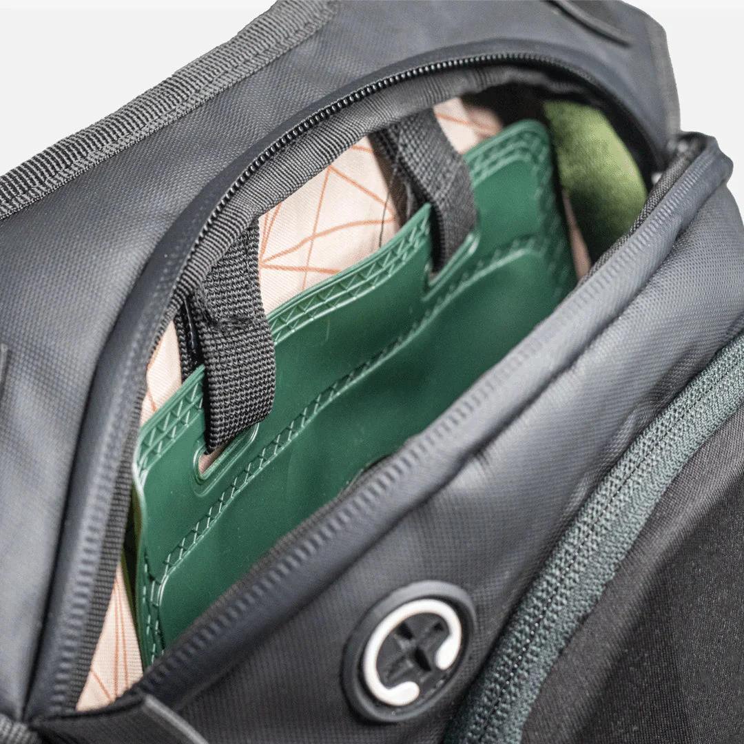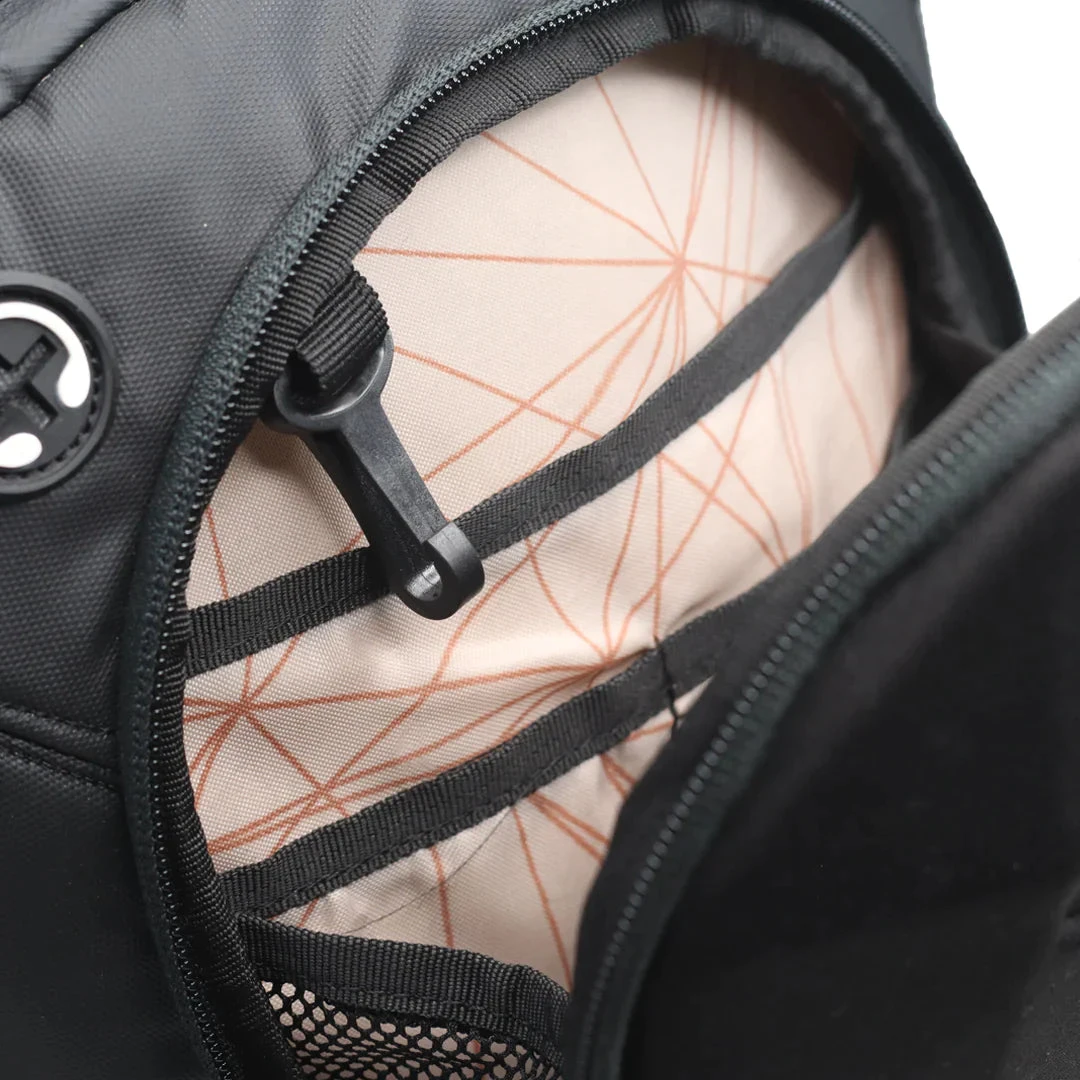 - Dedicated hydration bladder compartment with hook & loop secure strap for holding bladder in place and tube channel port.