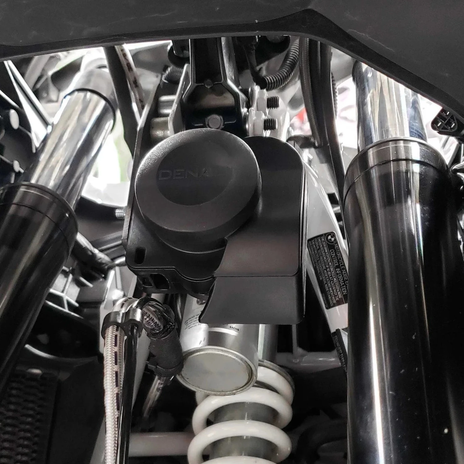 This vehicle specific split horn mount allows you to mount the DENALI SoundBomb Split Dual-Tone Air Horn in the optimum location on your BMW R 1250 GS/GSA. This kit includes one powder-coated steel bracket to mount the horn compressor behind the cylinder head and a second bracket to mount the horn acoustic unit centered under the fairing stay. Â