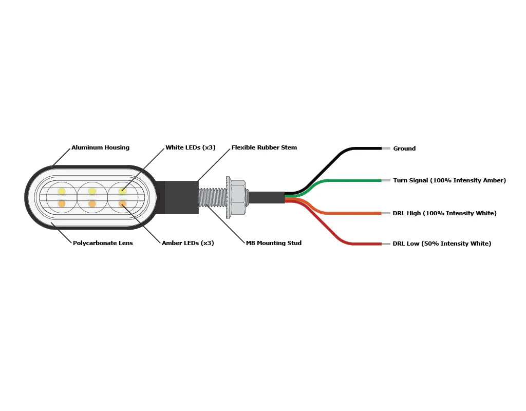 This M8 stud version of our T3 signal pod is designed to replace your factory turn signals. The T3s amber signal light is far brighter than stock but much smaller in size. The additional white DRL circuit provides maximum visibility without having to add a second set of auxiliary lights. Â